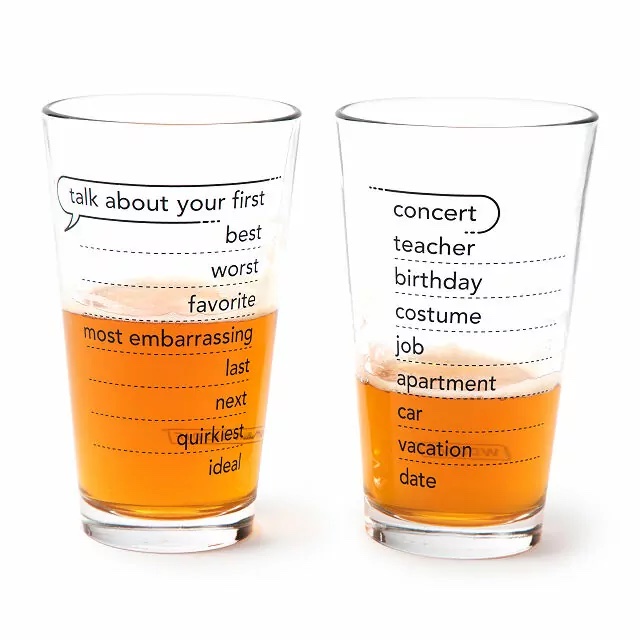 Zajímavé zpestření večera mohou přinést sklenice potištěné tipy na konverzační témata. Stačí si nalít plnou sklenici oblíbeného pití a s každým douškem vám pak nápisy na sklenici napoví nové zajímavé téma, o kterém se můžete bavit. Čím víc budete usrkávat, tím víc se o druhém dozvíte.