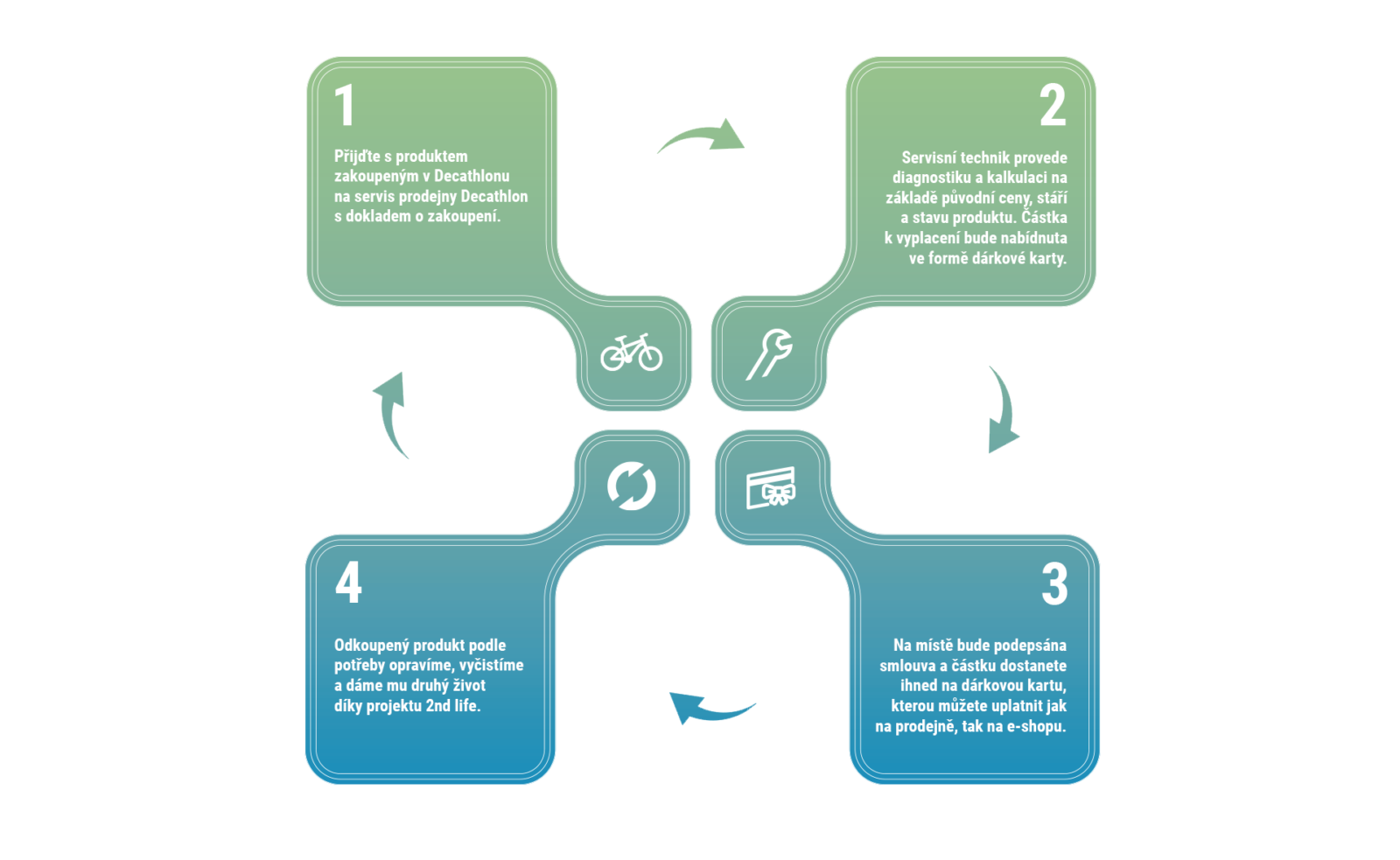 Jednou z nich je projekt BuyBack, ketrý Dechatlon spustil letos v červenci, kdy si ho ozkoušel na výkupu použitých dětských kol. Nyní vykupuje od zákazníků i další položky, které z různých důvodů člověk už nechce. Zákazníci, od nichž Decathlon zboží odkoupí, nedostanou peníze, ale dárkovou kartu, kterou pak mohou využít v jeho prodejnách. Od července tuto službu využili lidé s pětistovkou výrobků, za které dostali dohromady více než 800 tisíc korun. Přes devadesát procent zboží tvoří jízdní kola, přičemž dvě třetiny z nich jsou kola dětská. Od listopadu obchody přijímají také běžky, v nabídce by ale měly být i koloběžky, lyže a snowboardy. Všechno zmíněné zboží z druhé ruky pak jde také koupit.