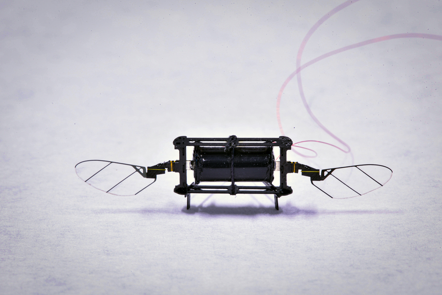 Vědci z MIT přišli s vylepšením miniaturních dronů, jejichž tělo tvoří sada čtyř křídel poháněných měkkým pohonem. Jejich aktuátory (umělé svaly) nově vyrábí z 20 vrstev elastomeru, které upevňují mezi dvě extrémně tenké elektrody a na to je balí do válečku. Elektrody poté stlačují elastomer, napětí se převádí na pohon a mechanika následně přiměje křídla k mávání.